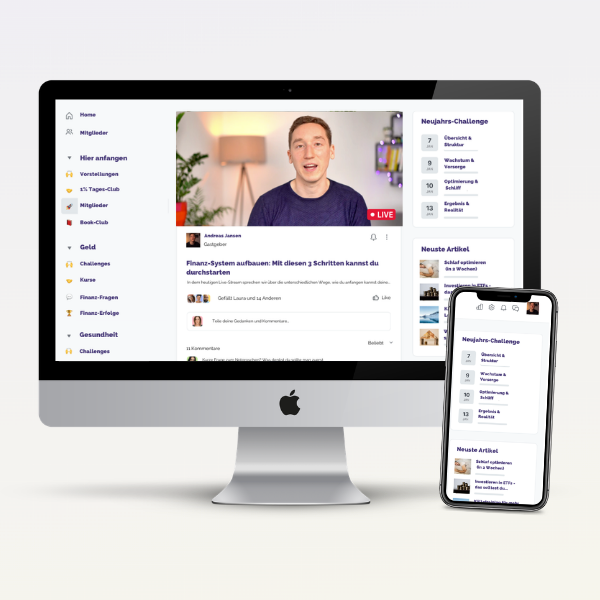 Erhalte Zugang zum exklusiven Online-Mitgliederbereich, nutze die digitalen Workbooks (126 Seiten) und zahlreiche wertvolle Tools wie das Finanz-Cockpit, Portfolio-Balancer und detaillierte Checklisten.